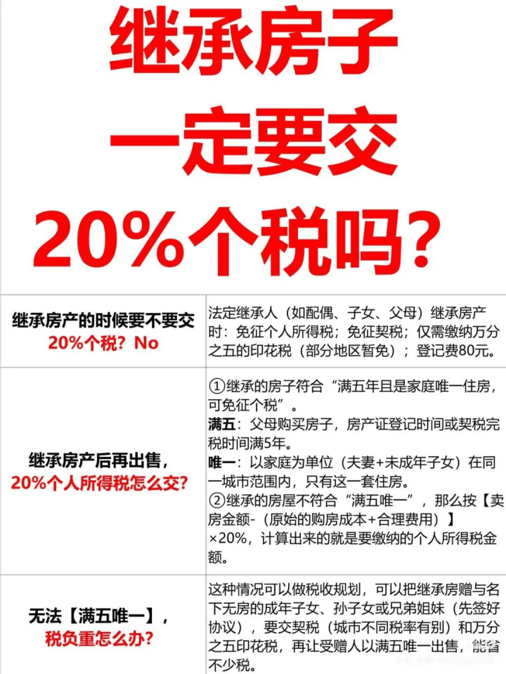 继承房子确实可能涉及20%的个人所得税,但它绝对不是“一刀切”,更不是“按卖房总价算”。